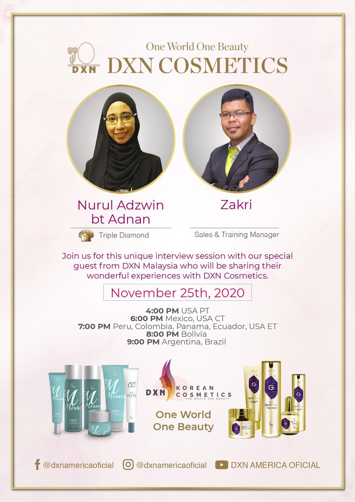 Únete con nosotros en vivo 25 de noviembre a la 4:00 PM US PT con nuestros invitados especiales de DXN Malaysia, para compartir sus maravillosas experiencias con DXN Cosmetics.